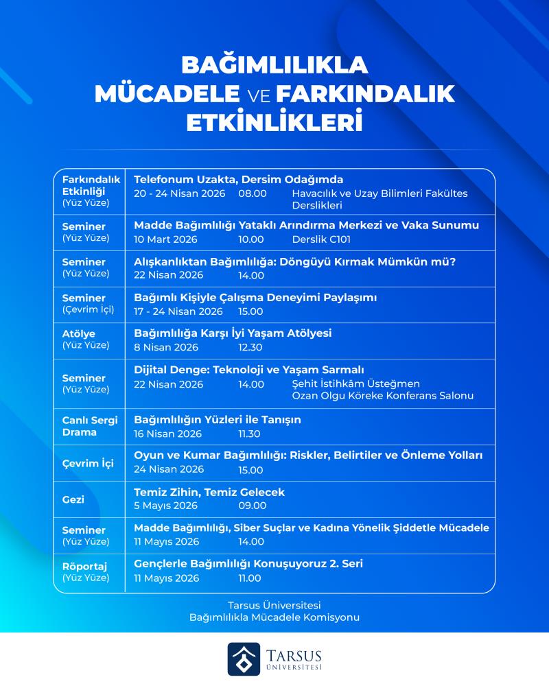 Tarsus Üniversitesi Bağımlılıkla Mücadele Komisyonu tarafından düzenlenen “Bağımlılıkla Mücadele ve Farkındalık Etkinlikleri”, öğrencilerde ve akademisyenlerde bağımlılık konusunda bilinç oluşturmayı, sağlıklı yaşam alışkanlıklarını desteklemeyi ve farklı bağımlılık türlerine karşı farkındalık geliştirmeyi amaçlamaktadır. Nisan–Mayıs 2026 tarihleri arasında gerçekleştirilecek program kapsamında seminerler, atölyeler, sergi, röportaj ve farkındalık etkinlikleri yer almaktadır.